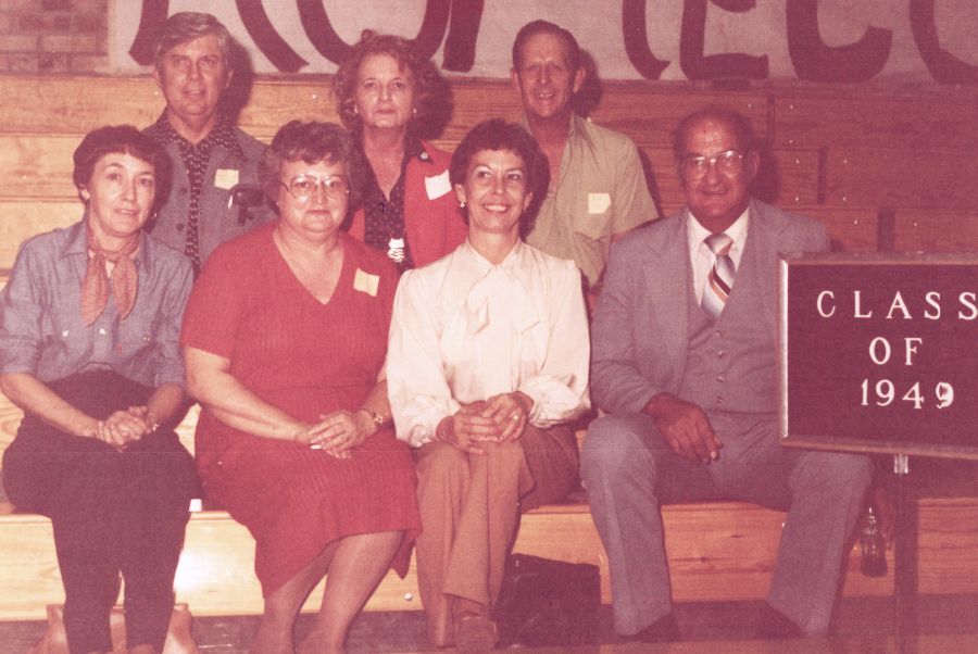 RHS-1949 Reunion in 1999 (50th Anniversary) held in Ranger in May of 1999. Seated, left to right, Mary Lou Townzen Samford, Betty Reuwer Cook, Byrellene Parkes Kai, Camilla Gordon Adams, Nancy Phillips Bridge, June Ann Morton Bryan; second row, Clara Jean Sharp Houx, Maxine Landtroop Morris, Pauline Williams Wright, James Martinez; third row, Hudson Hightower, Joyce Harbin Hejtmancik, Jane Hardy Blacklock, Dortha Hightower Blitch, Joan Kenney Munnerlyn and Jeanne Kenney Hewitt; top row, R.C. Smith, Billy Jack Perrin, Meredith Sides, Keith Munnerlyn, Beth Pearson Cosper and Jack Waddington.