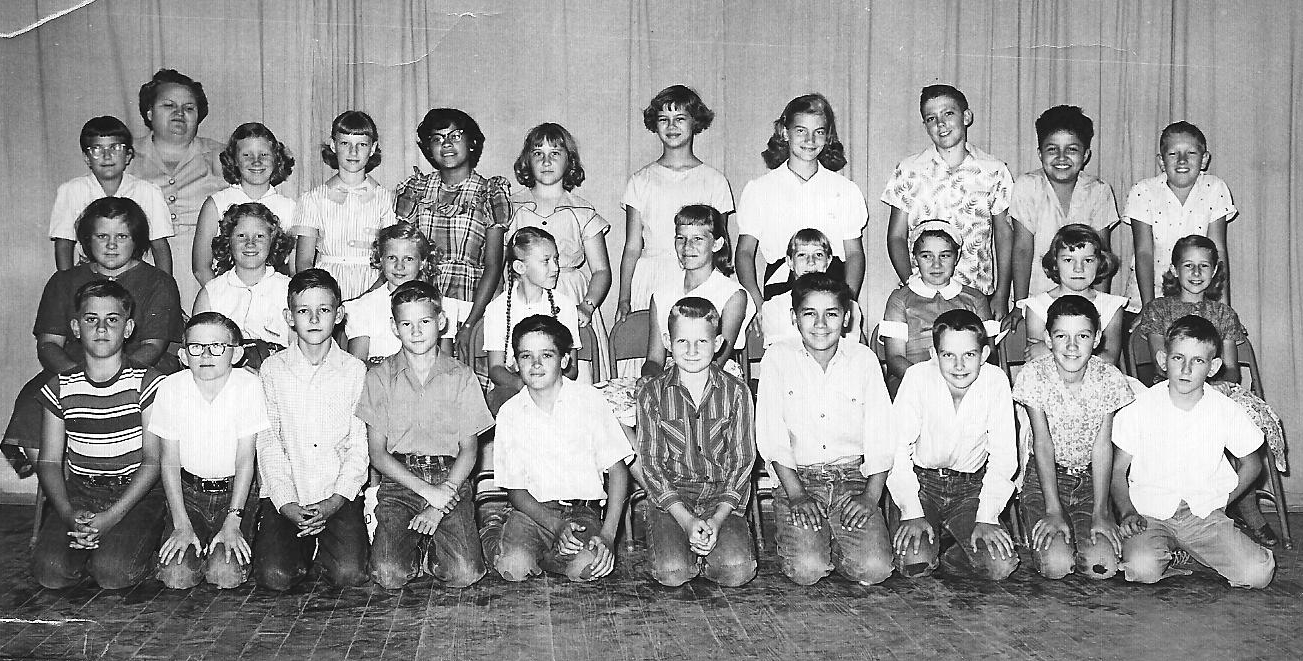 Miss Worden's 5th-grade class in 1954-55 at Hodges Oak Park School enlarge Back row: Dedee Nuessle, Miss Worden, Emma Lou Montgomery, Donna Sue Crumley, Wilma Mendoza, ?, Pat Kim, ?, ?, Bernie Soto, Bill Faircloth (?). Middle row: Billie Jean Cerice, Carol Sue Montgomery, Linda Rushing, Shellene Scott, ?, June Loper ?, ?, ?, Elaine Lavoie. Front Row: Dayle Penney, J.D. Baker, Ronny Tye, Frank Miller, Charles Lemmous, Joe Barker, Tommy Camacho, Jack Noth, Tim Brasher, ?.