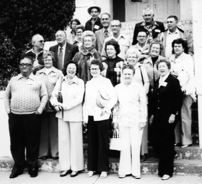 RHS-1936 Homecoming in 1979 (enlarge) Back row: Hazel Barker Harris, Bill Bordeau, Inez Falls Hunt. Middle row: Helen Collum Adkins, Inez Pounds Belknap, Roy Spiess, Mellenger Jacoby, Philip Kribbs, Durwood Bush Front row: Lem Bray, Geneva Eaves, Wanda Castleberry Rapp, Camilla Hunt McGlo, Roy Hanson, Jen Craver Harrison, Earnest Glazner, Tommy Smith.