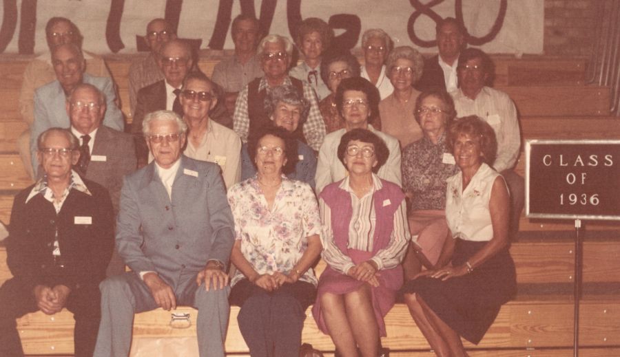 RHS-1936 Homecoming in 1980 (enlarge) Back row: , Barcus Coalson, Woodrow Dinsmore, Oleta Pounds Surles, Vera Bryan Bell, Stephen Preslar Third row: , Mellenger Jacoby, Roy Hanson, Vivian Cranshaw, Inez Pounds Belknap, Phillip Kribbs Second row: William Bourdeau, , Jen Craver Hanson, Inez Falls Hunt, Hazel Barker Harris Front row: Earnest Glazner, Lem Bray, Wanda C. Rapp, Camilla Hunt McLaughlin, Mavis Murray Smith.