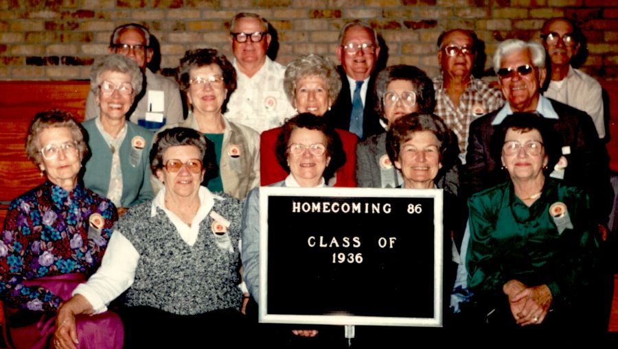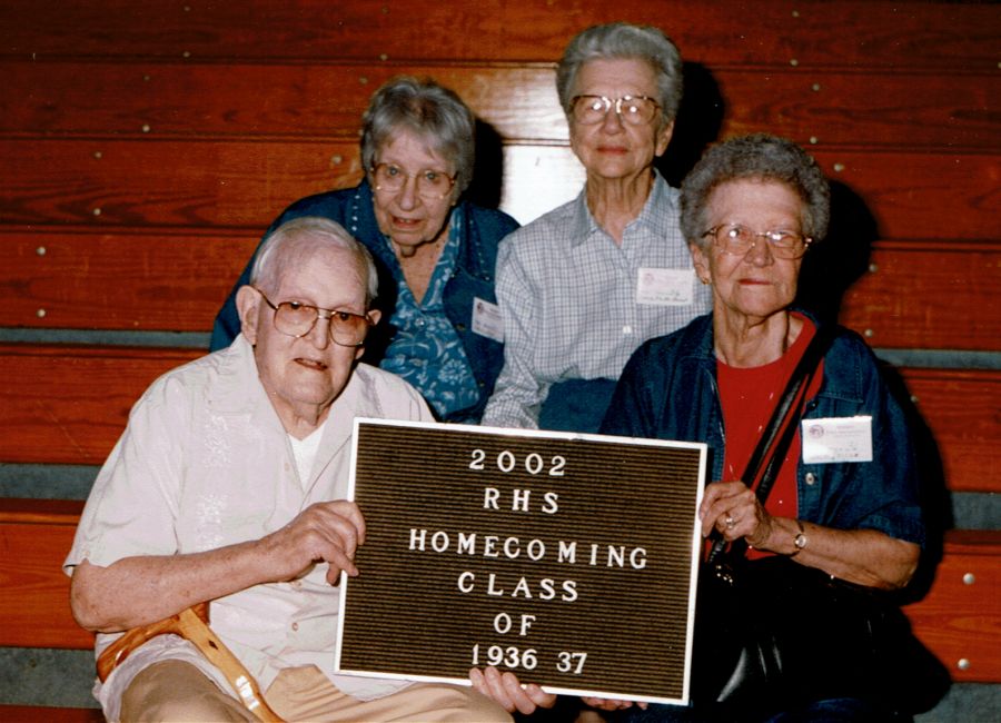RHS-1936 Homecoming in 1992 (enlarge) Back row: Ray Hanson, Mellenger Jacoby, Bill Bourdeau, Charles Hodges, Durwood Bush Middle row: Jen Craver Hanson, Mary B. Cox, Bill Cox, Inez Pounds Belknap Front row: Inez Falls Hunt, Wanda C. Rapp, Lem Bray.
