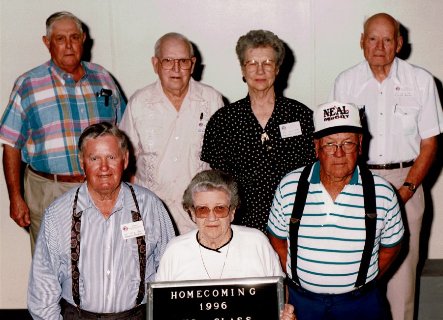 RHS-1936 Homecoming in 1988 Top row: Ernest Glazner, Durwood Bush. 2nd row: Stephen Preslar, Mellenger Jacoby, William "Billy" Bourdeau, Bill Cox Front row: Inez Falls Hunt, Wanda Castleberry Rapp, Inez Pounds Belknap, Mary Cox.