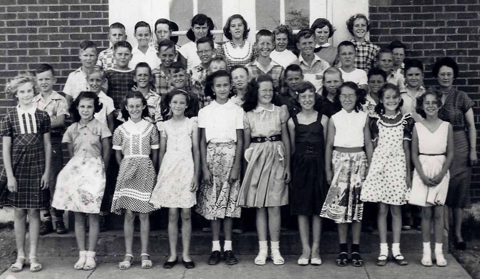 Playground at Young School in 1954 (enlarge) Top row (L-R): Martha Whitehead, Jeanie Getts, Joyce Johnson, Glenda Raines, Betty Vinson. Seated (L-R): Margaret Obel, Carol Phillips, Nellie Sue Vinson, Patsy Vinson.