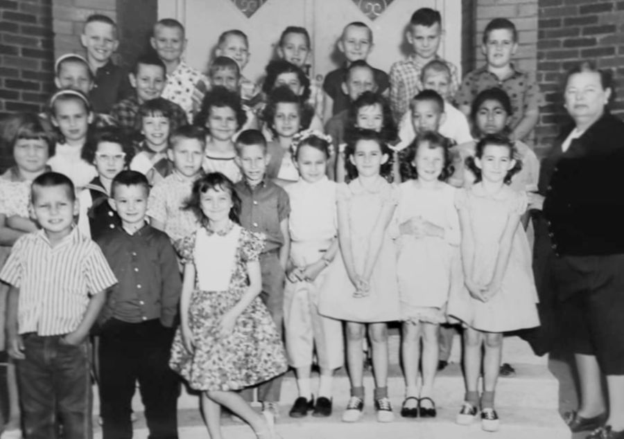RHS-1970 1st grade at Young School (enlarge) Bottom left: Vicki Stiffler, Kathy Myers, Margaret Williams, Richard Williams, Tino Hernandez, Carl Foster, Dwight Vinson, Rhonda Reid, Joyce Leonard, Kenneth Poynor. Top left: Teacher Mrs. Bobo, Kathleen Cole, Barbara Perrin, Rick Hatfield, George Beighley, Teresa Vasquez, Ruby Huckaby, Chris ??, Nina Lynn Wright, Susie Offield, Gary Bennett, Denis Kennedy.
